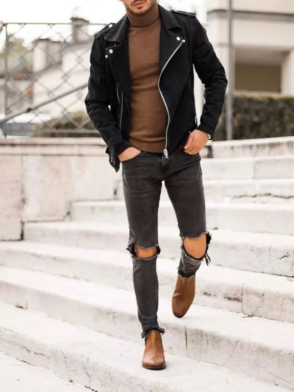 Men in leather jackets, high-neck, and jeans